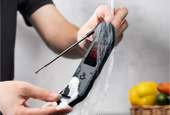 Clean with alcohol or a food-safe anti-bacterial wipe to prevent cross-contamination. Additionally, it's recommended to quickly rinse the device with running water for efficient cleaning.