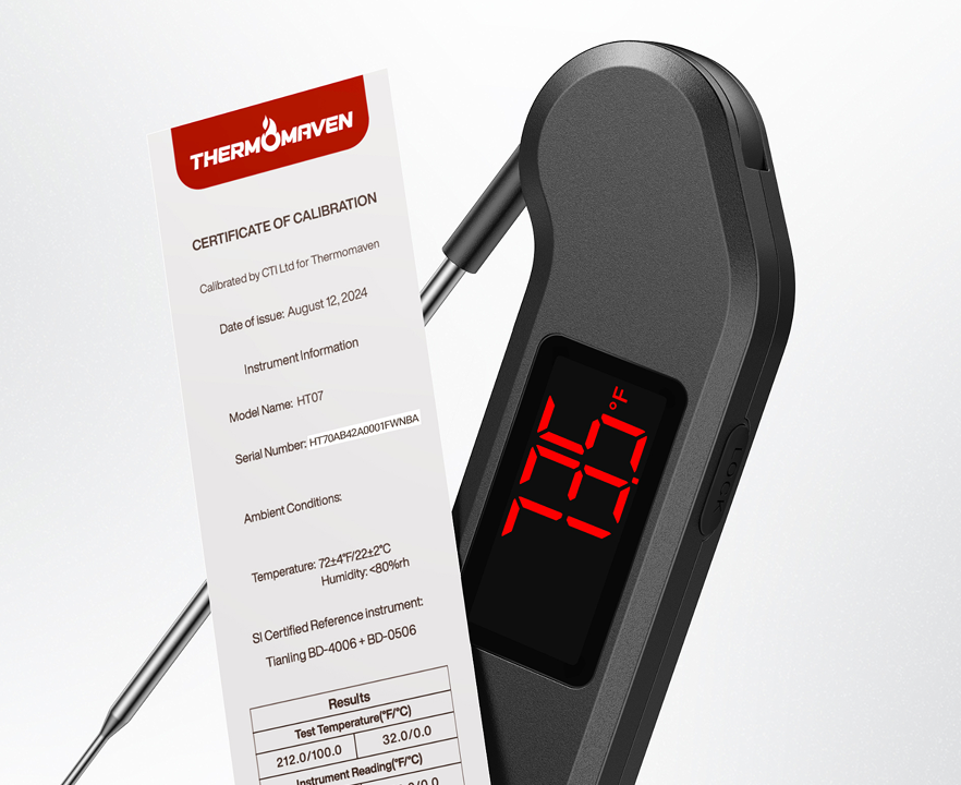 Typically, the ThermoMaven F1 Stealth maintains its accuracy and will not require recalibration. But if a temperature discrepancy is suspected, follow these steps for calibration: Fill an insulated cup with ice made from distilled or purified water. Add enough water to cover the ice. Turn on the device and immerse the probe in the ice water, stirring continuously for one minute. The reading should stabilize between 31.5℉ (0.27°C) to 32.5℉(0.27°C). If not, and it's outside of the 28.4℉ (-0.2°C) and 35.6℉ (0.2°C) range, the calibration cannot proceed. To initiate calibration mode, press and hold the ℃/℉ button and the LOCK button for five seconds. On successful calibration, "Suc" will flash on the screen. If it shows "Err", repeat the calibration process.