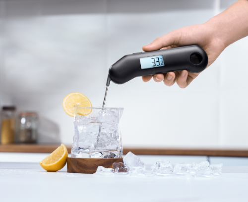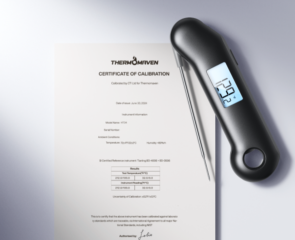 Typically, the ThermoMaven F1 Turbo maintains its accuracy and will not require recalibration. But if a temperature discrepancy is suspected, follow these steps for calibration: Fill an insulated cup with ice made from distilled or purified water. Add enough water to cover the ice. Turn on the device and immerse the probe in the ice water, stirring continuously for one minute. The reading should stabilize between 31.5℉ (0.27°C) to 32.5℉(0.27°C). If not, and it's outside of the 28.4℉ (-0.2°C) and 35.6℉ (0.2°C) range, the calibration cannot proceed. To initiate calibration mode, press and hold the ℃/℉ button and the LOCK button for five seconds. On successful calibration, "Suc" will flash on the screen. If it shows "Err", repeat the calibration process.